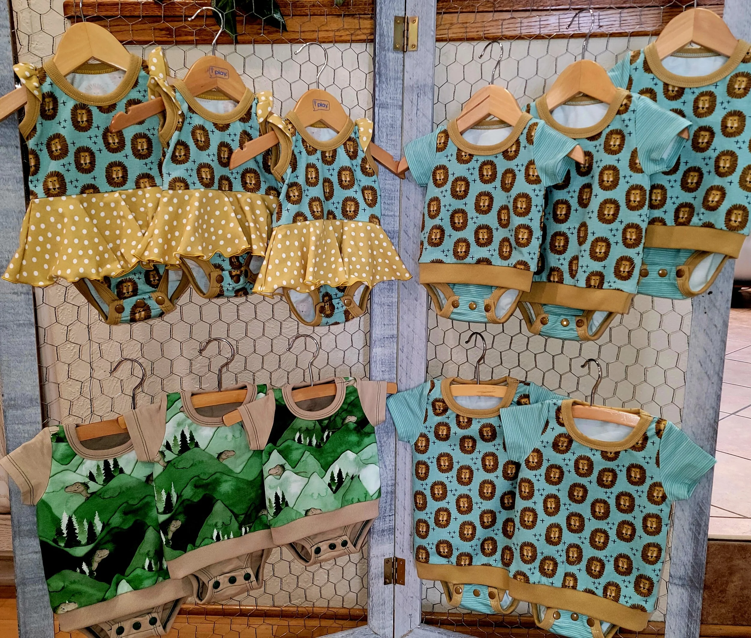Baby East Rompers. Easy access with only two snaps. Matching bibs and booties. Sizes are 0-3m, 3-6m, and 6-9m. Bibs are French Terry and Bamboo. French Terry and Organic cotton/modal for the rompers...sooo soft! Sold as a set or separately.
